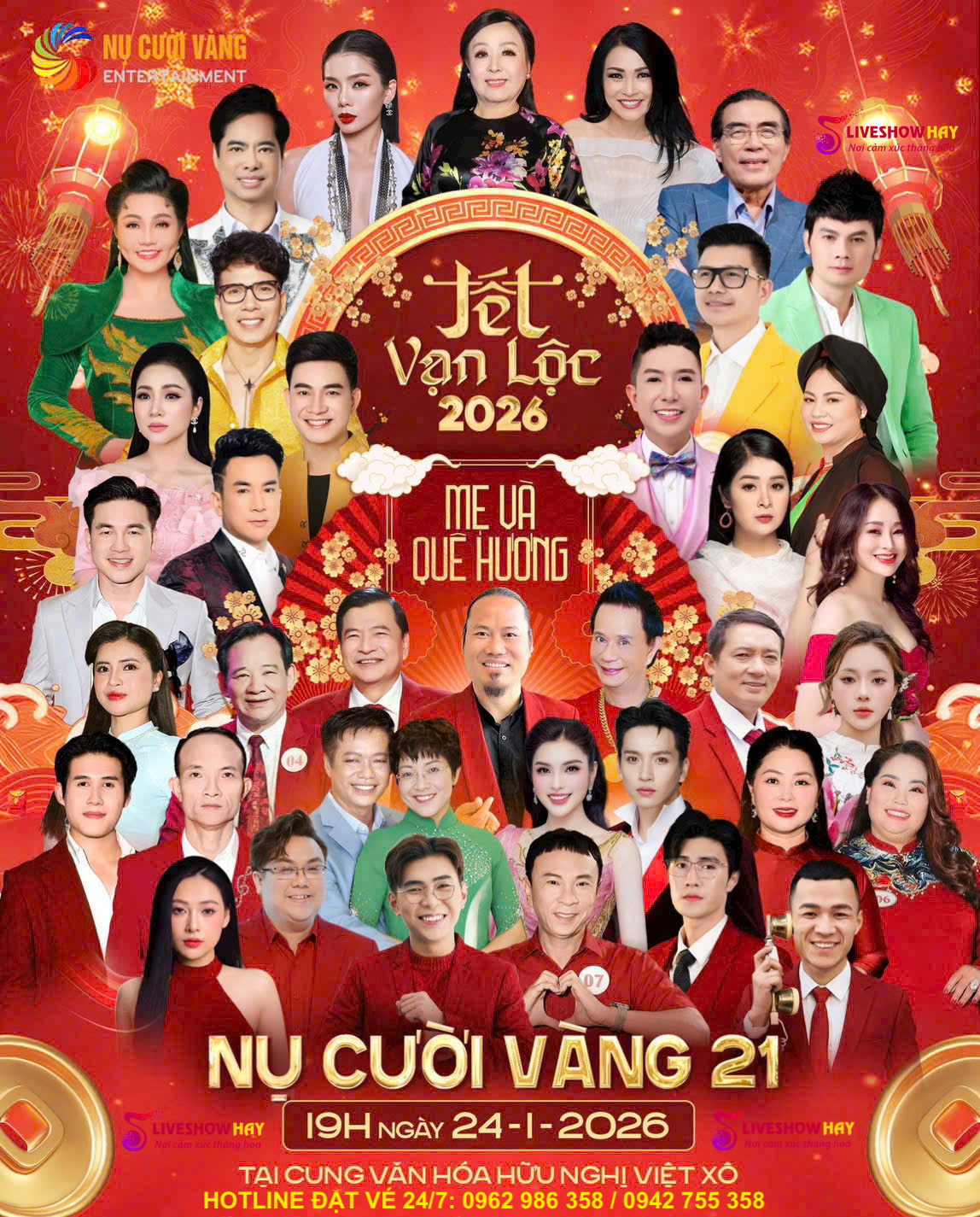 Liveshow Đêm Nhạc Tết Vạn Lộc 2026 diễn ra vào 19h00, Thứ 7 ngày 24/1/2026 tại Cung Văn Hoá Hữu Nghị Việt Xô, số 91 Trần Hưng Đạo, Hà Nội. Gọi mua vé: 0962 986 358 / 0942 755 358.