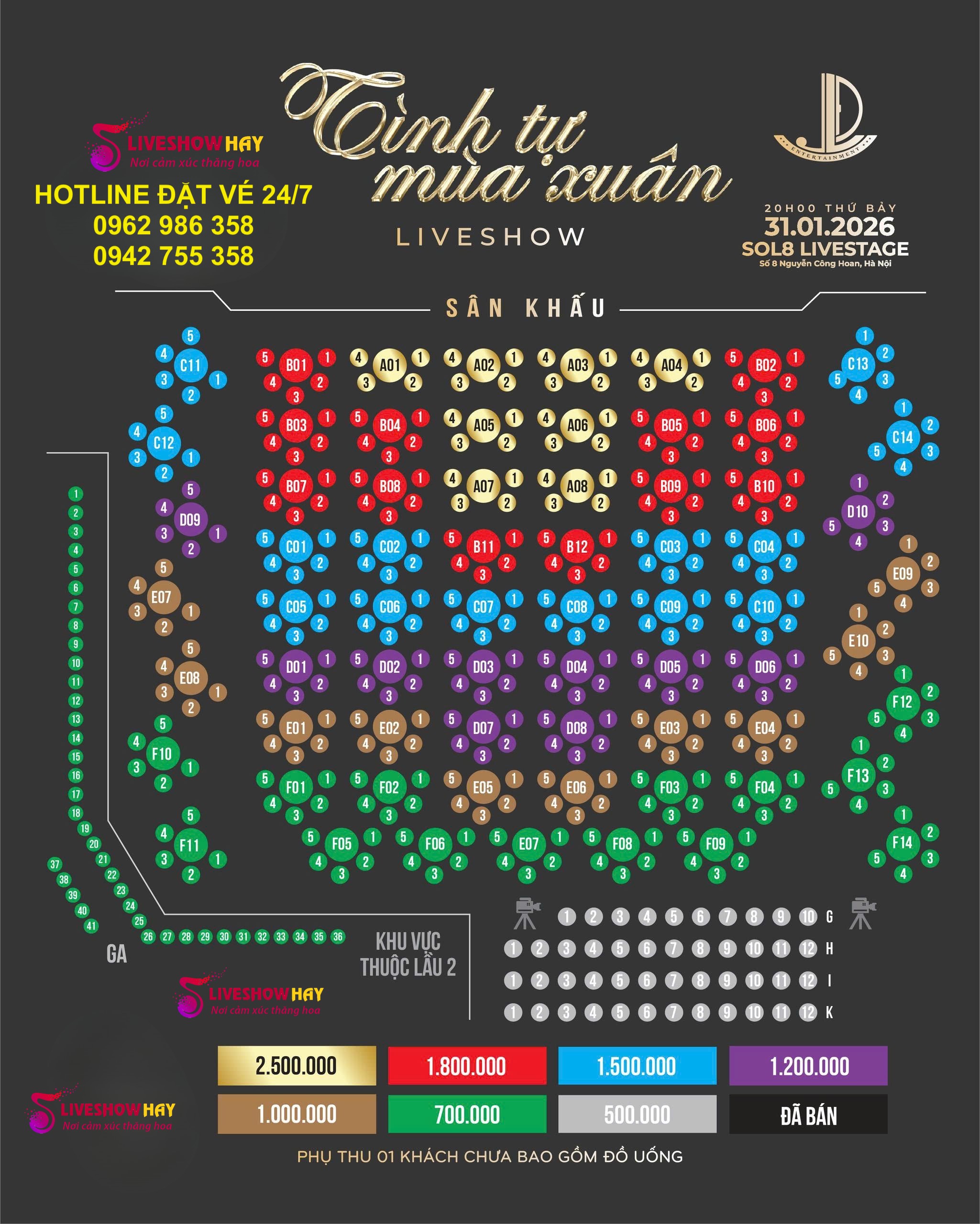 Giá vé: 500k – 700k – 1tr – 1,2tr – 1,5tr – 1,8tr – 2,5tr