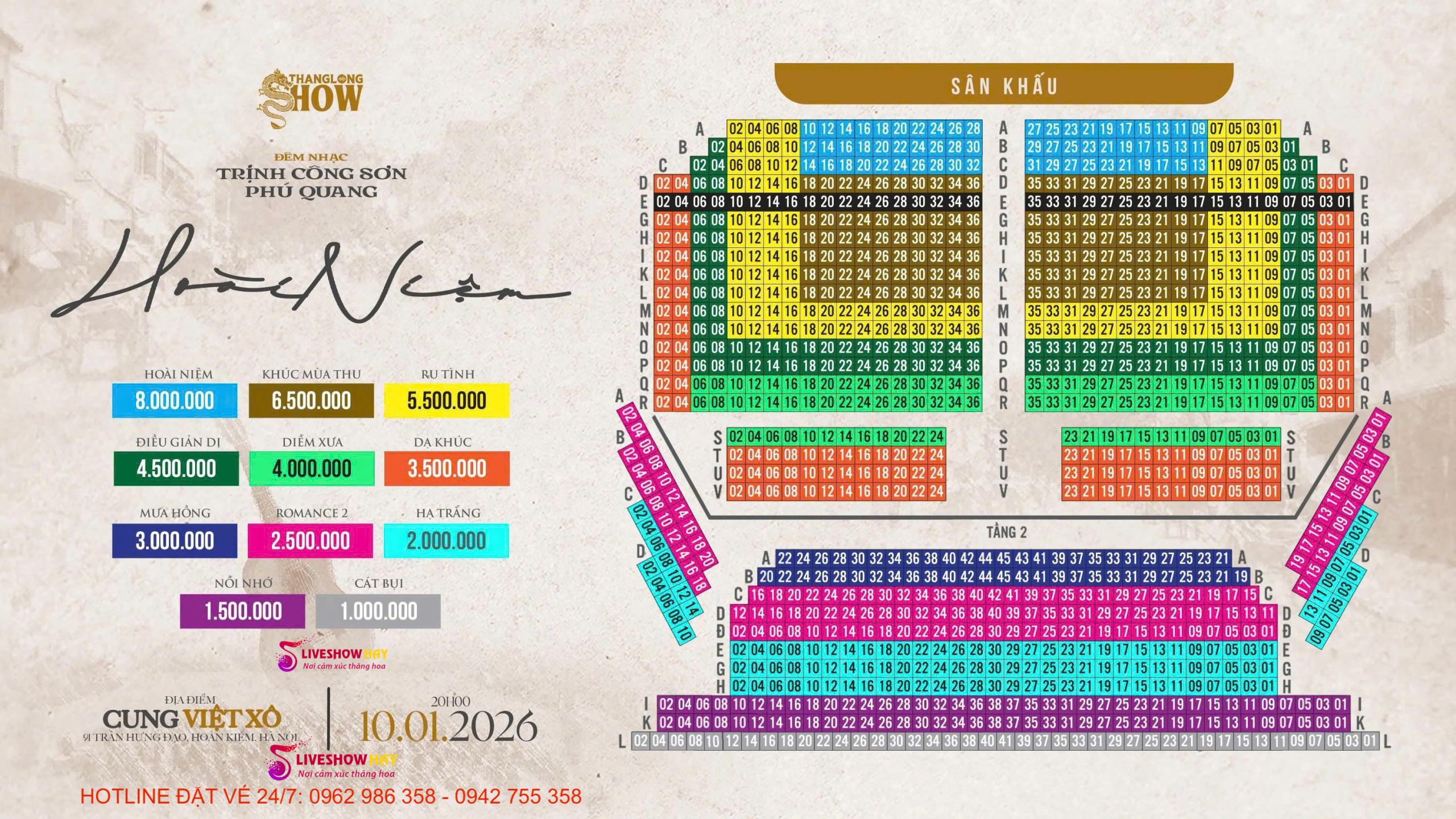 Mua Vé Liveshow Đêm Nhạc Trịnh Công Sơn, Phú Quang – Hoài Niệm Ngày 10/01/2026 Tại Hà Nội – VÉ ĐẸP TỪ BAN TỔ CHỨC. Gọi mua vé : 0942 755 358 / 0962 986 358 – (Xem SƠ ĐỒ VÉ bên dưới bài viết)