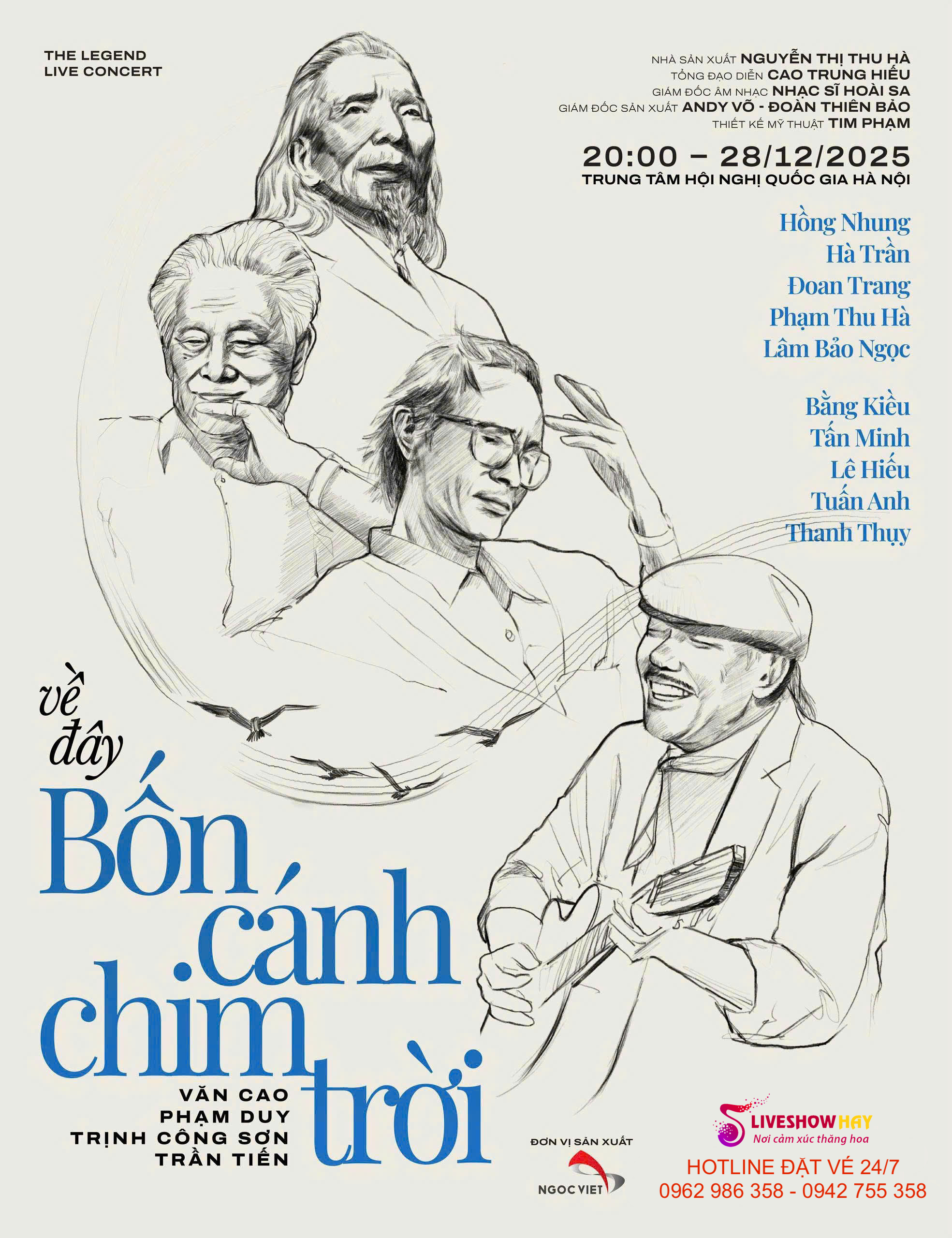 LiveshowHay xin trân trọng gửi đến khán giả Liveshow đêm nhạc Về Đây Bốn Cánh Chim Trời – The Legend Live Concert – Nhạc Sỹ Trần Tiến, Trịnh Công Sơn, Văn Cao, Phạm Duy ngày 28/12/2025 tại Hà Nội