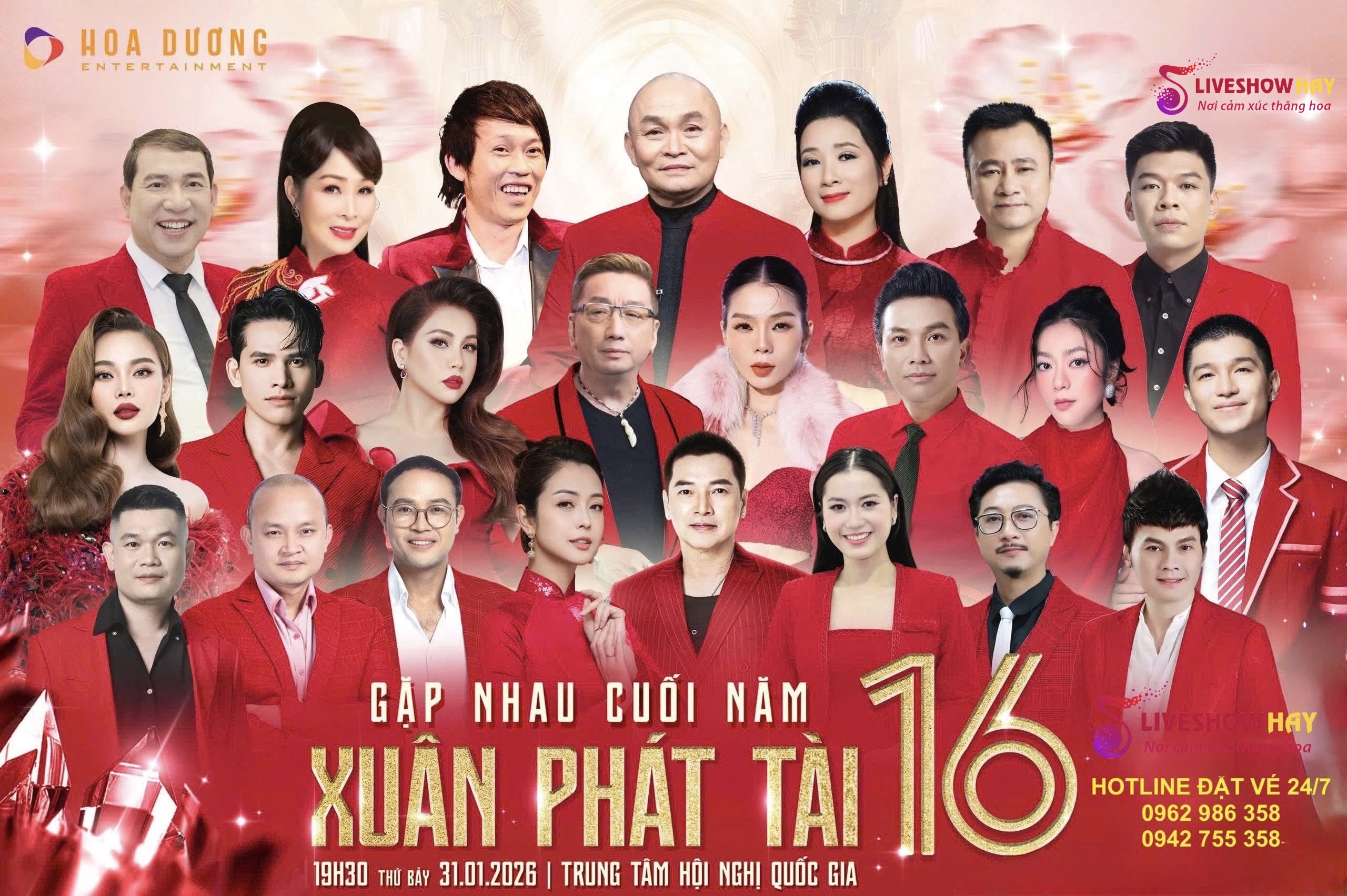 Liveshow Đêm Nhạc Xuân Phát Tài 16 diễn ra vào 19h30, Thứ 7 ngày 31/1/2026 tại Trung tâm Hội nghị Quốc gia, cổng số 1 Đại lộ Thăng Long, Hà Nội. Gọi mua vé: 0962 986 358 / 0942 755 358.